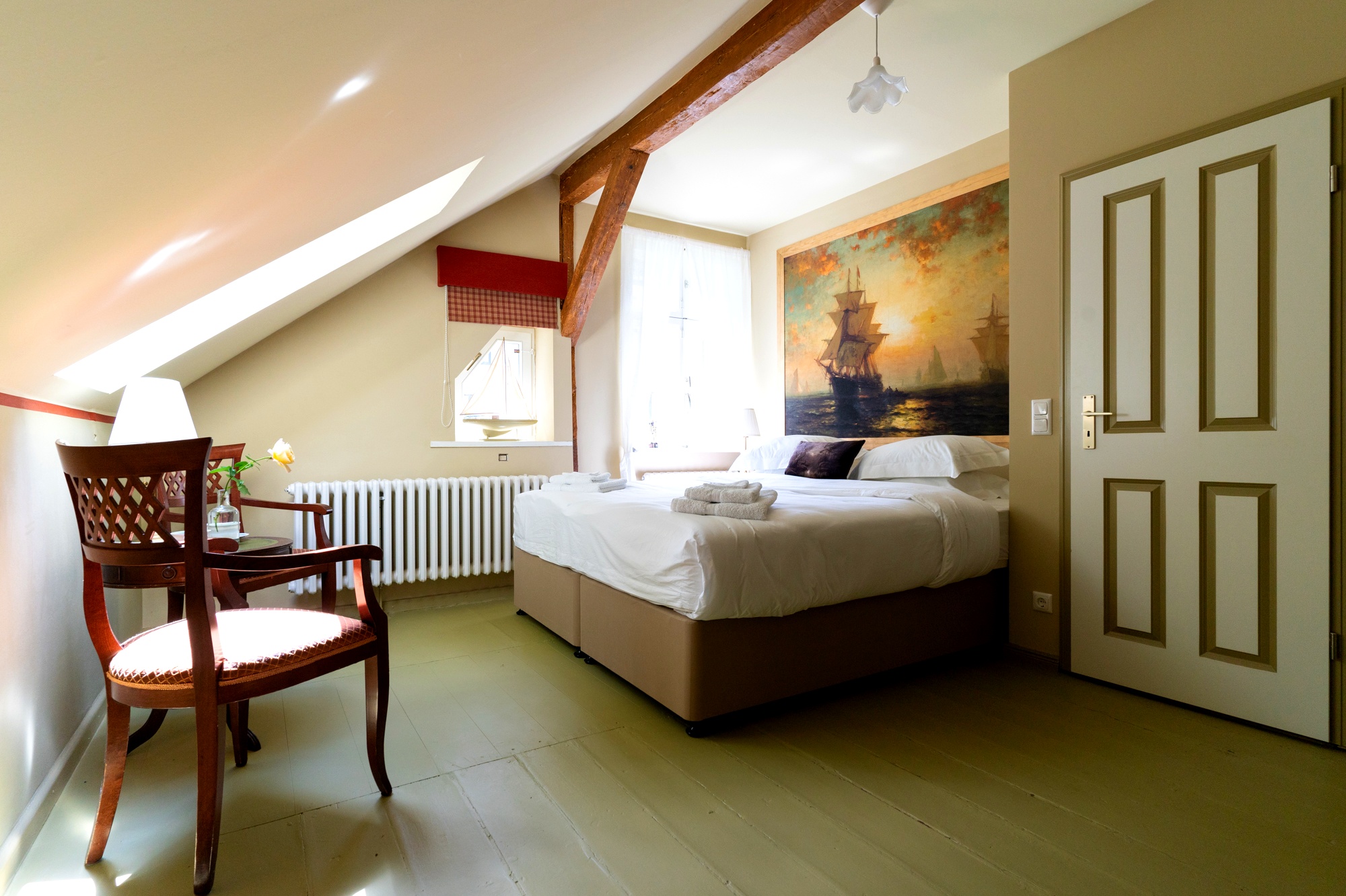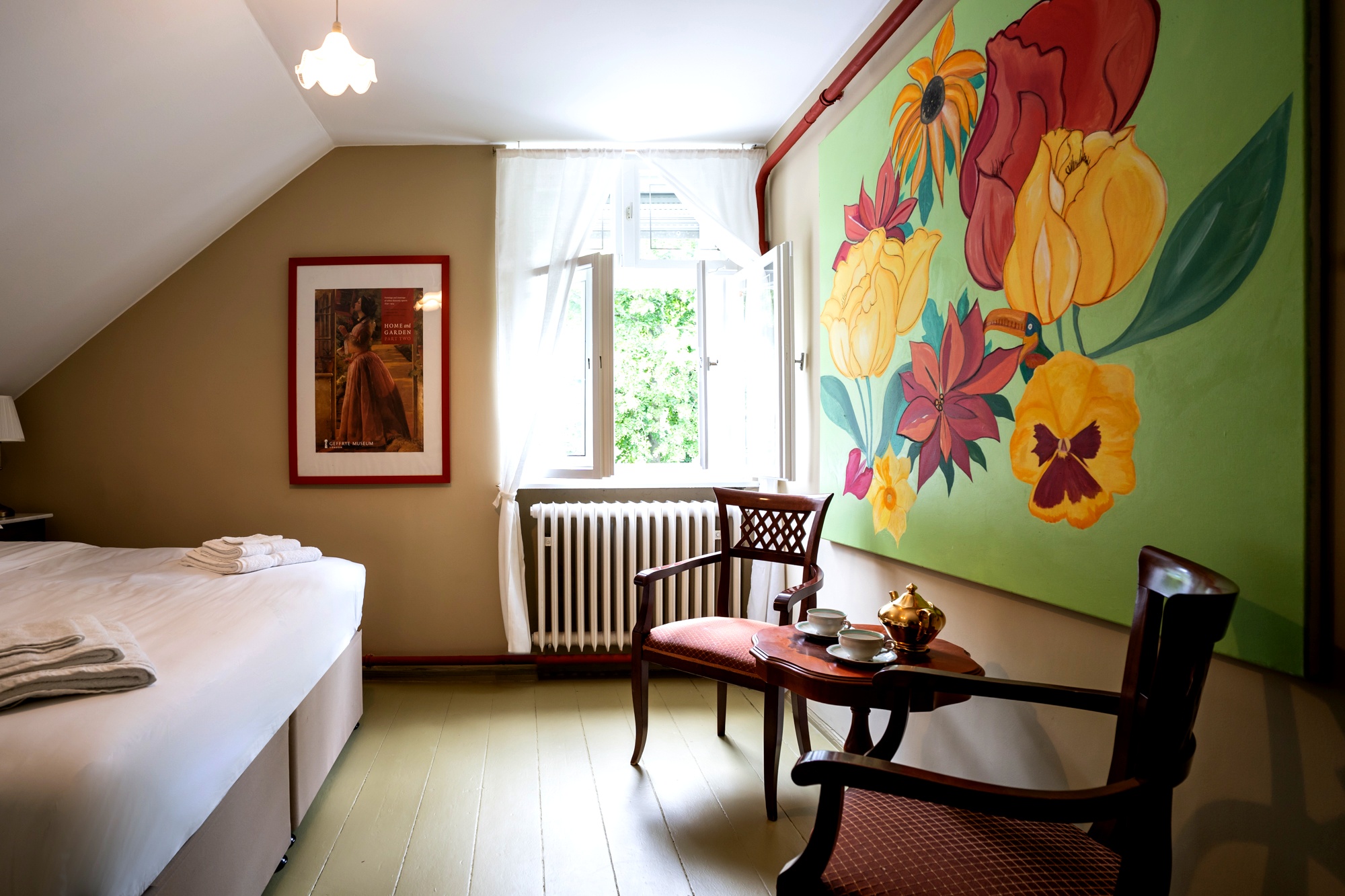 Rooms and prices: We offer you a friendly, personal service in a tranquil and relaxed atmosphere and it is of great importance to us that you feel comfortable in our home! The listed building has recently been restored to its original character and all rooms are individually themed with an elegant blend of history and art. We operate a quiet policy at Unter den Linden so there are no TV’s in the bedrooms. 120,-€ per room